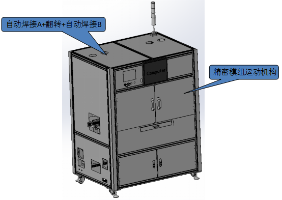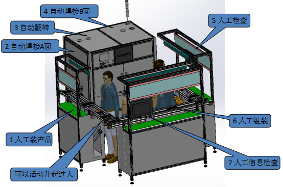人工裝配產品,自動焊接A面,自動翻轉,自動焊接B,人工檢查,人工裝配和人工信息檢查等七個工位,共需要4位作業人員協作完成。